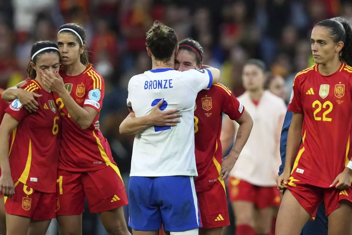 England's Lucy Bronze, hugs Spain's Mariona Caldentey at the end of the Women's Euro 2025 final soccer match between England and Spain at St. Jakob-Park in Basel, Switzerland, Sunday, July 27, 2025. (AP Photo/Alessandra Tarantino)