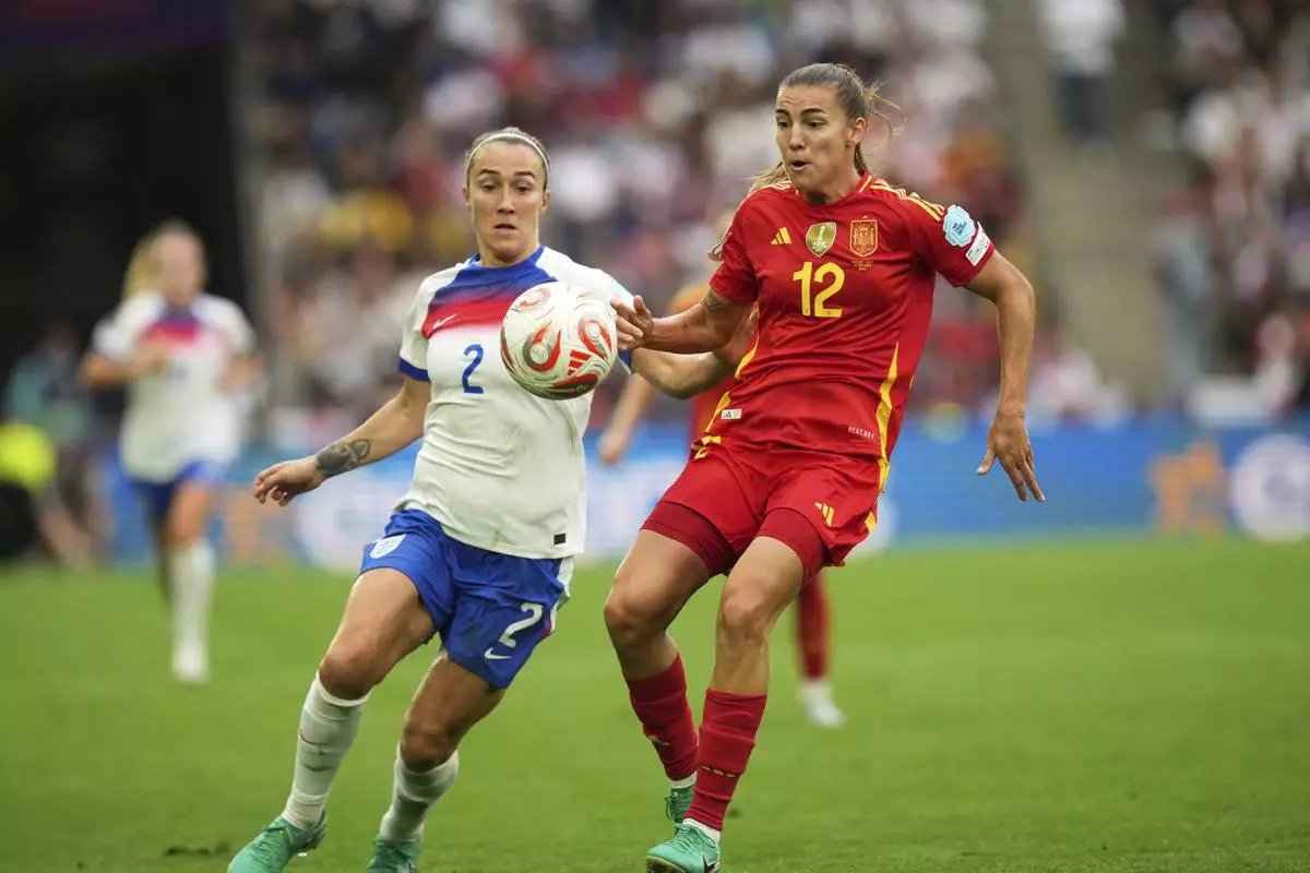 Spain's Mariona Caldentey, left, challenges England's Lucy Bronze during the Women's Euro 2025 final soccer match between England and Spain at St. Jakob-Park in Basel, Switzerland, Sunday, July 27, 2025. (AP Photo/Martin Meissner)