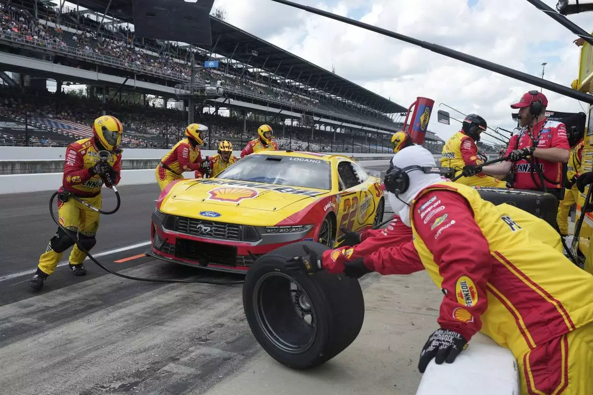 Joey Logano makes a pit stop during a NASCAR Cup Series auto race at Indianapolis Motor Speedway, Sunday, July 27, 2025, in Indianapolis. (AP Photo/Darron Cummings)