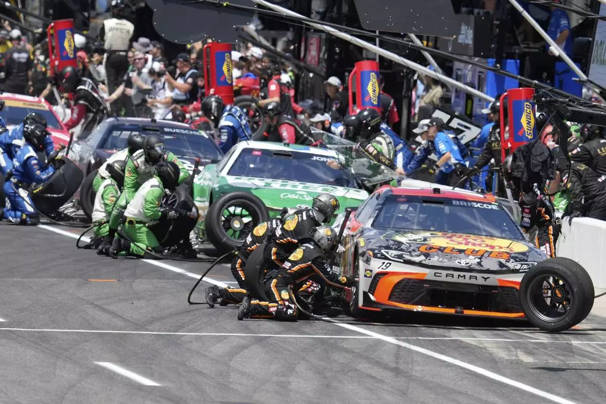 Chase Briscoe makes a pit stop during the NASCAR Cup Series auto race at Indianapolis Motor Speedway, Sunday, July 27, 2025, in Indianapolis. (AP Photo/Darron Cummings)
