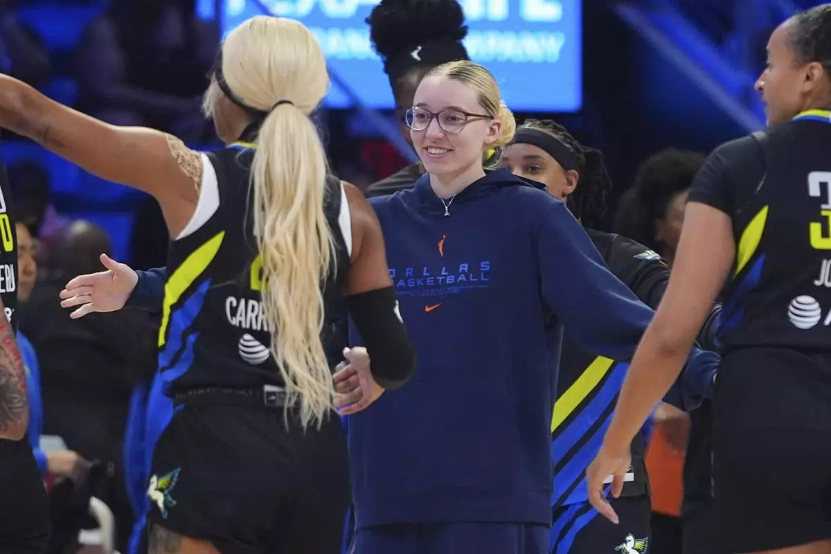 An injured Dallas Wings guard Paige Bueckers, center, reaches to teammates from the bench during a timeout during the first half of a WNBA basketball game against the Las Vegas Aces in Arlington, Texas, Sunday, July 27, 2025. (AP Photo/LM Otero)