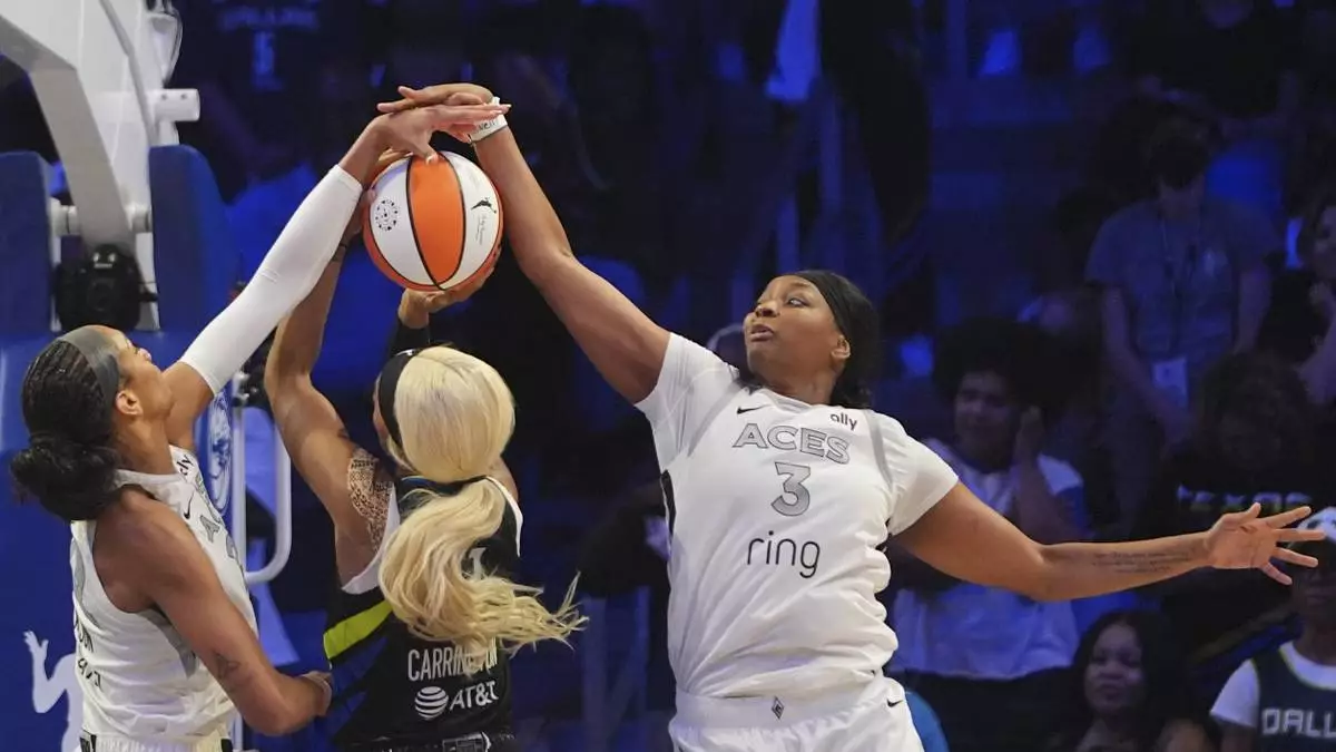 Dallas Wings guard DiJonai Carrington is stopped by Las Vegas Aces forward NaLyssa Smith (3) and center A'ja Wilson (22) during the second half of a WNBA basketball game in Arlington, Texas, Sunday, July 27, 2025. (AP Photo/LM Otero)