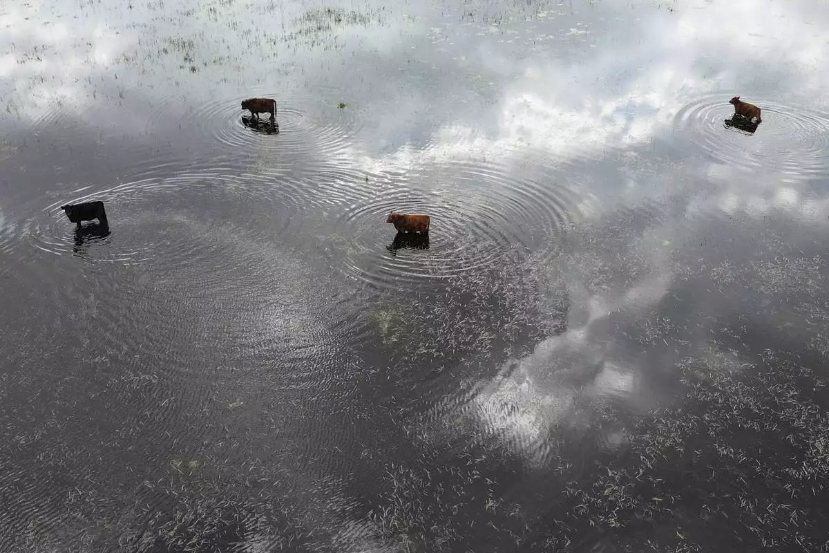 Cows stand in floodwaters at a farm in Buenos Aires province, Argentina, Friday, July 25, 2025. (AP Photo/Natacha Pisarenko)