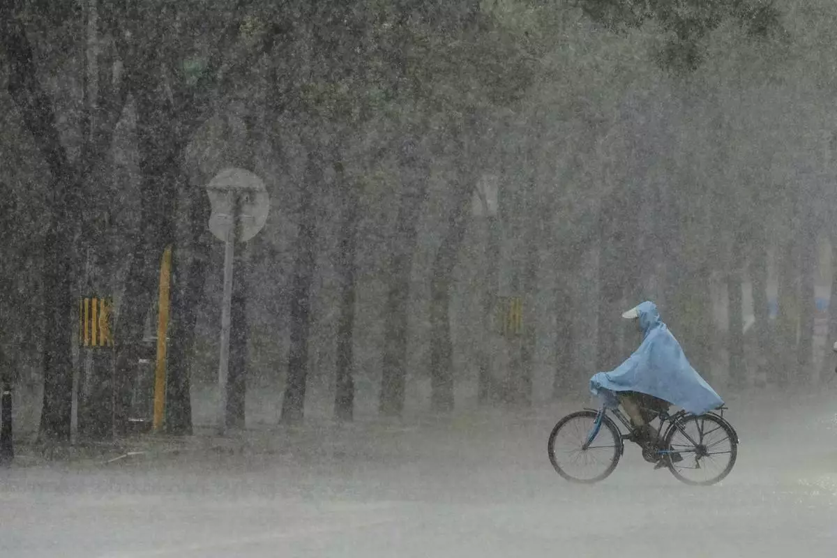 A man rides a bicycle during heavy rain in Beijing, China, Sunday, July 27, 2025. (AP Photo/Mahesh Kumar A.)