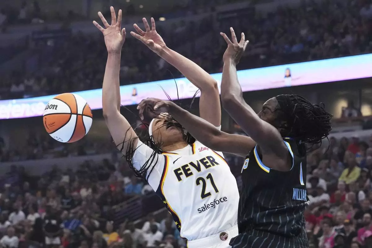Chicago Sky center Elizabeth Williams, right, blocks a shot by Indiana Fever forward Makayla Timpson, left, during the first half of a WNBA basketball game Sunday, July 27, 2025, in Chicago. (AP Photo/Nam Y. Huh)
