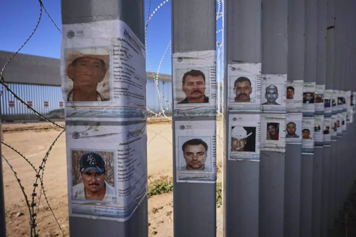Posters for missing people line the border wall separating Mexico and the United States near where it meets the Pacific Ocean Friday, July 25, 2025, in Tijuana, Mexico. (AP Photo/Gregory Bull)