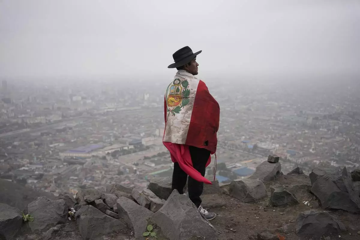A demonstrator taking part in a march against a recently approved amnesty law that benefits military members and civilians prosecuted for human rights abuses during the country's armed conflict stands on a hill overlooking Lima, Peru, Sunday, July 27, 2025. (AP Photo/Martin Mejia)