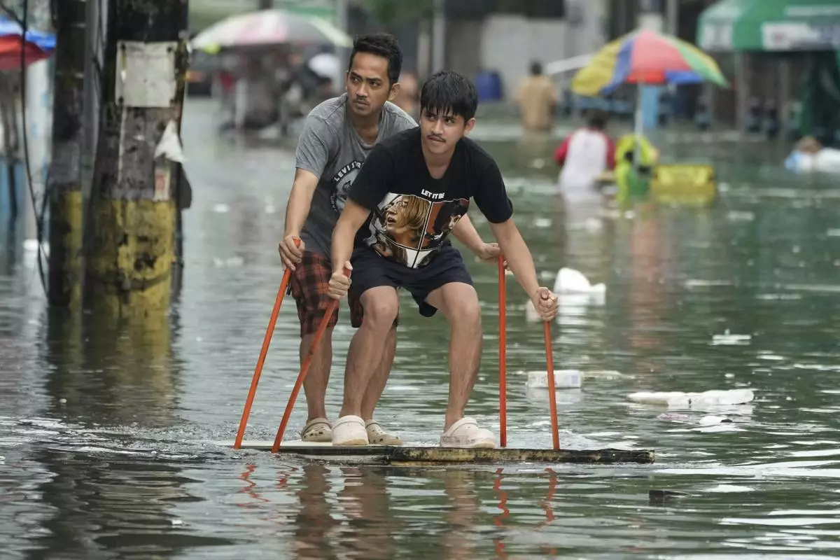 Residents use poles as they ride an improvised float along a flooded road as Typhoon Co-may intensified seasonal monsoon rains at Malabon city, Philippines on Friday, July 25, 2025. (AP Photo/Aaron Favila)