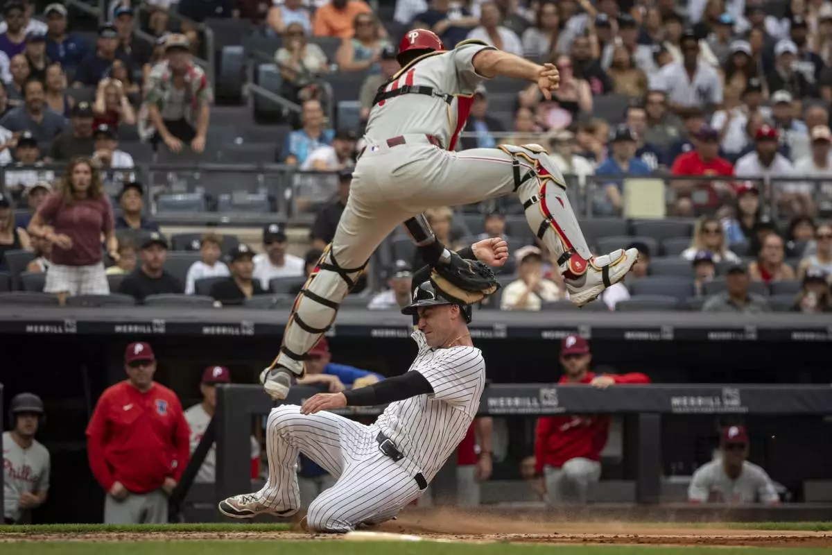 New York Yankees' Cody Bellinger, bottom, is tagged out at home plate by Philadelphia Phillies catcher J.T. Realmuto, top, during the third inning of a baseball game, Sunday, July 27, 2025, in New York. (AP Photo/Angelina Katsanis)