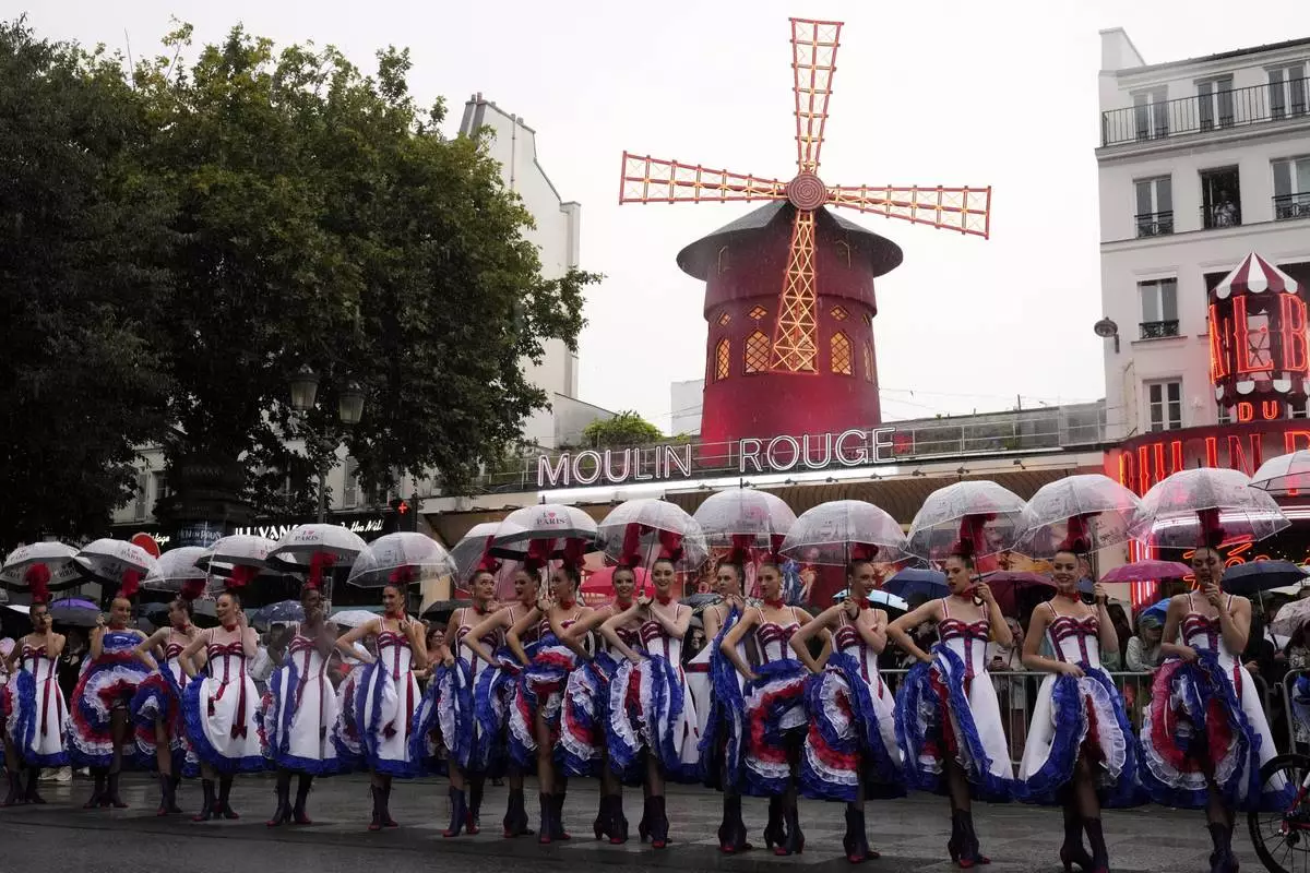 Moulin Rouge cabaret dancers hold umbrellas during the last stage of the Tour de France cycling race between Mantes-la-Ville and Paris, Sunday, July 27, 2025 in Paris (AP Photo/Michel Euler)