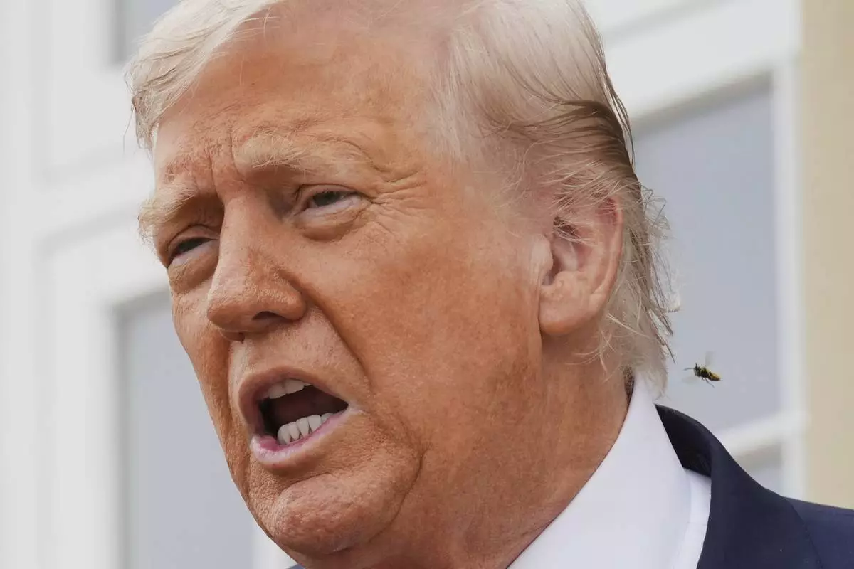An insect hovers near President Donald Trump as he speaks with the media during an official greeting with Britain's Prime Minister Keir Starmer and his wife Victoria at the Trump Turnberry golf course in Turnberry, Scotland Monday, July 28, 2025. (AP Photo/Jacquelyn Martin)