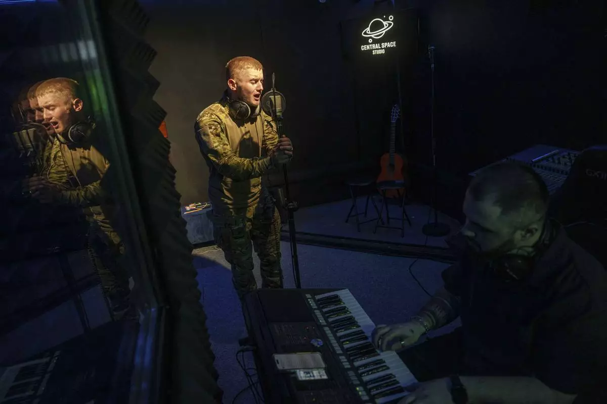 Ukrainian soldier Denys Zalizko, 21, sings a song at a recording studio in Kyiv, Ukraine, Tuesday, July 15, 2025. (AP Photo/Evgeniy Maloletka)