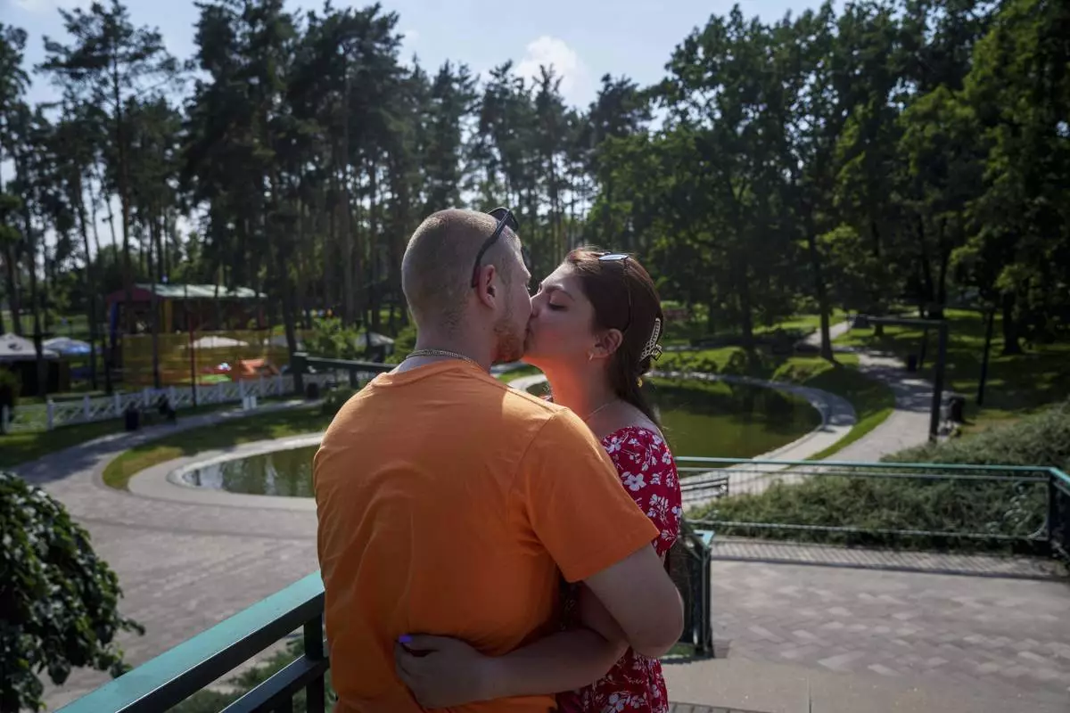 Ukrainian marine Stanislav Tarnavskyi kisses his girlfriend, Tetiana Baieva, in Irpin, Ukraine, Tuesday, July 8, 2025. (AP Photo/Evgeniy Maloletka)