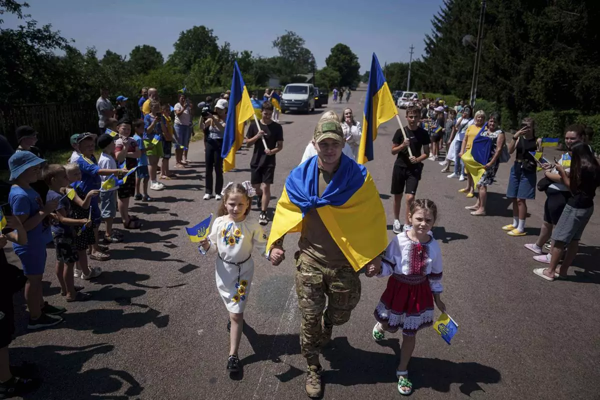 Ukrainian soldier Denys Zalizko, 21, walks though his fellow villagers after returning from Russian captivity in Holovyno, Zhytomyr region, Ukraine, Monday, July 7, 2025. (AP Photo/Evgeniy Maloletka)
