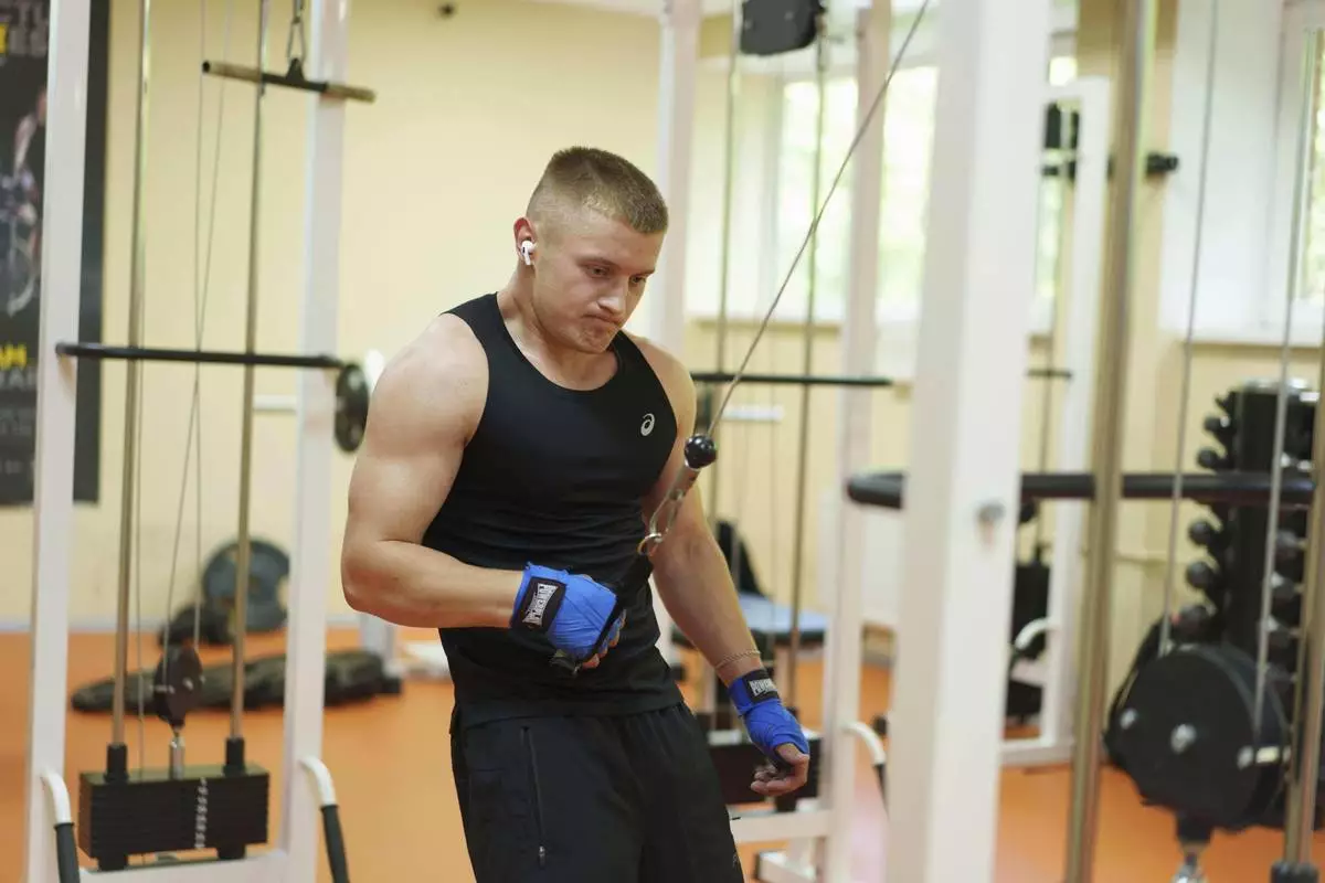 Ukrainian soldier Denys Zalizko, 21, works out in a gym at a rehabilitation center in Kyiv region, Ukraine, Wednesday, July 2, 2025. (AP Photo/Evgeniy Maloletka)