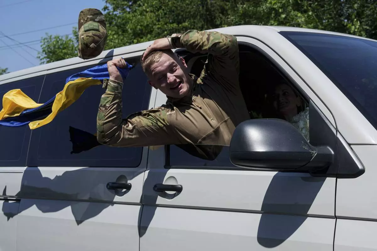 Ukrainian soldier Denys Zalizko, 21, greets his fellow villagers after returning from Russian captivity in Holovyno, Zhytomyr region, Ukraine, Monday, July 7, 2025. (AP Photo/Evgeniy Maloletka)