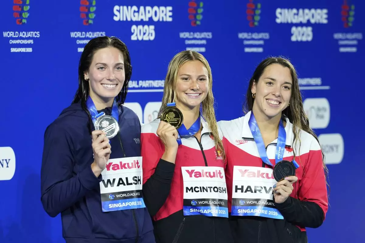 Gold medalist Summer McIntosh of Canada, center, flanked by silver medalist Alex Walsh of the United States, left, and bronze medalist Mary-Sophie Harvey of Canada pose on the podium after the women's 200-meter individual medley final at the World Aquatics Championships in Singapore, Monday, July 28, 2025. (AP Photo/Vincent Thian)