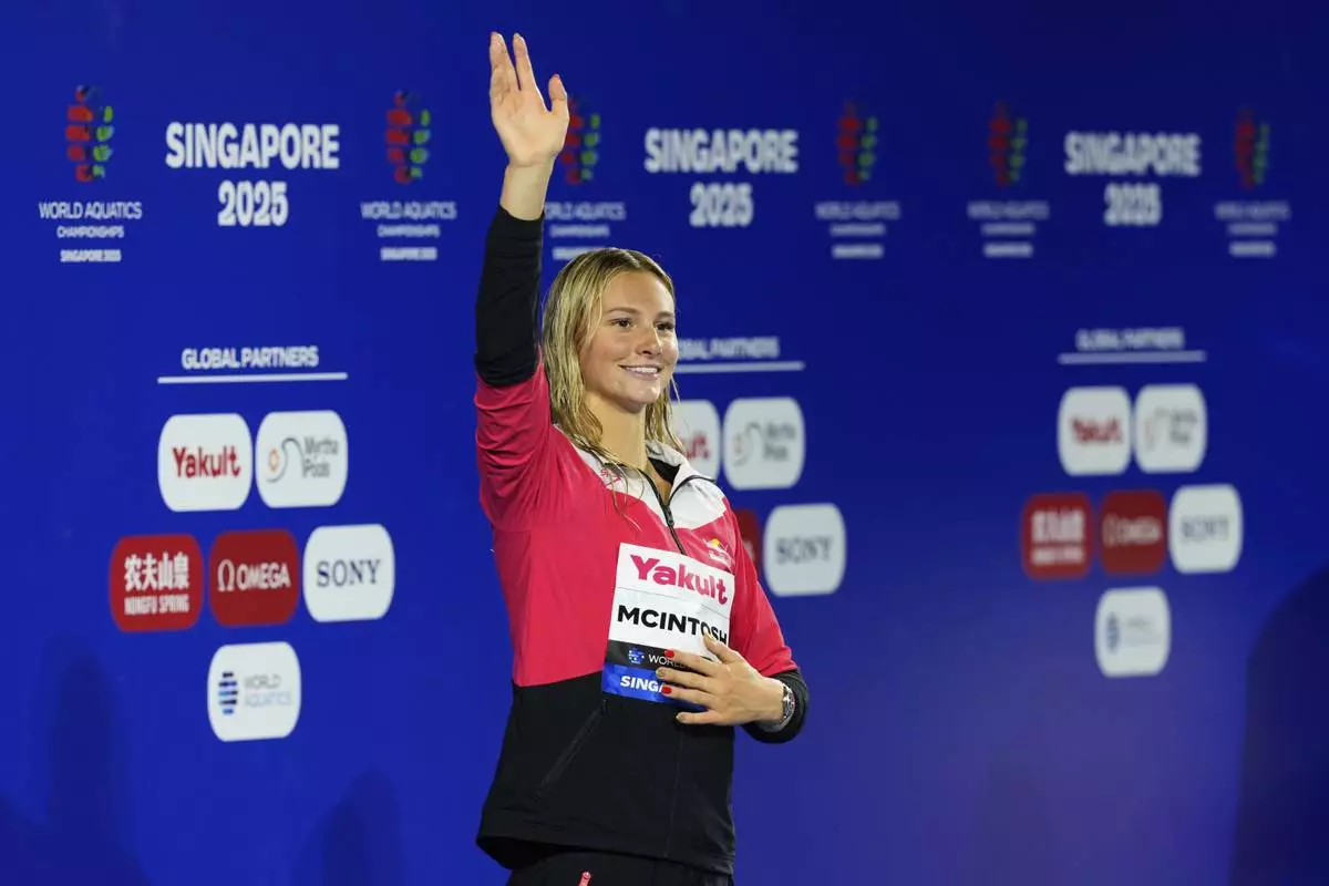 Gold medalist Summer McIntosh of Canada celebrates on the podium after the women's 200-meter individual medley final at the World Aquatics Championships in Singapore, Monday, July 28, 2025. (AP Photo/Vincent Thian)