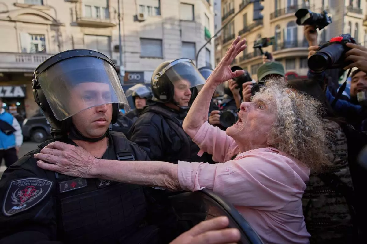 Delia Donn, 78, gestures to a riot policeman near Congress during weekly protests demanding better pensions for retirees, in Buenos Aires, Argentina, Wednesday, July 30, 2025. (AP Photo/Rodrigo Abd)