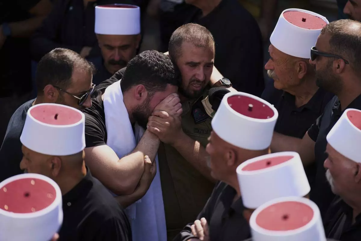 Relatives of Druze Israeli captain Amir Saad, who was killed in a battle in the Gaza Strip, mourn during his funeral in the village of Yanuh Jat, northern Israel, Sunday, July 27, 2025. (AP Photo/Ariel Schalit)