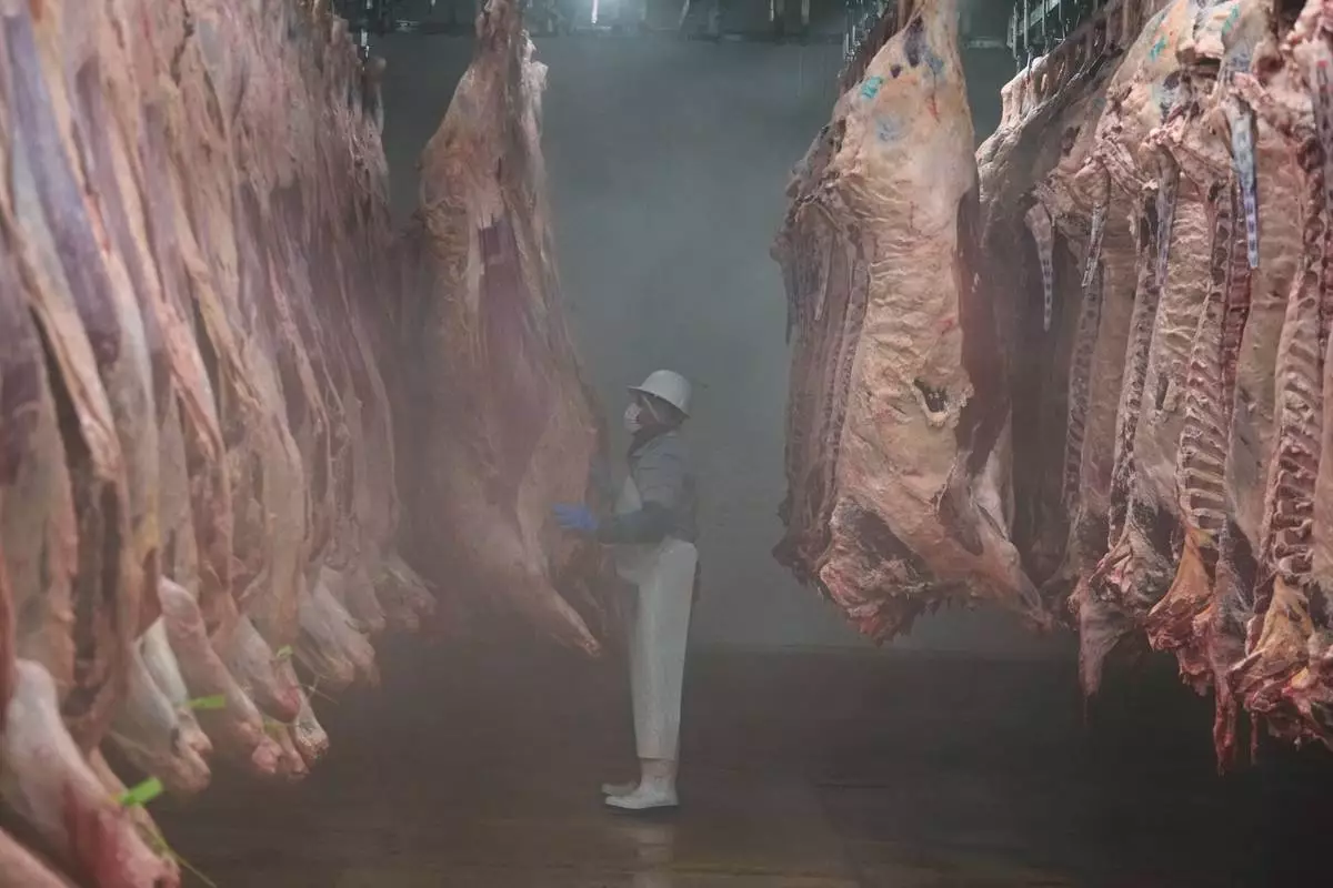 A worker sorts beef carcasses at an export-oriented slaughterhouse in Hermosillo, Mexico, Monday, July 28, 2025. (AP Photo/Fernando Llano)