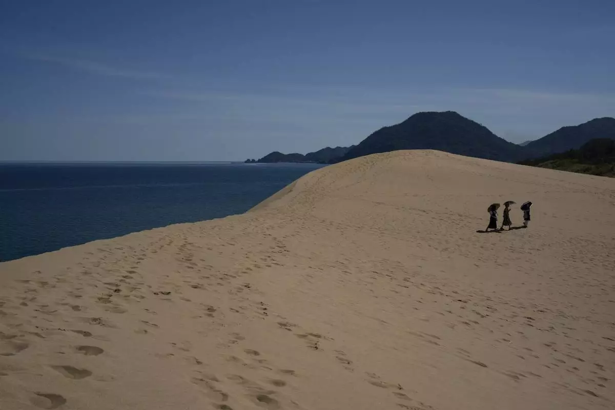 Visitors holding parasols walk through the Tottori Sand Dunes in Tottori Prefecture, Monday, July 28, 2025. (AP Photo/Louise Delmotte)