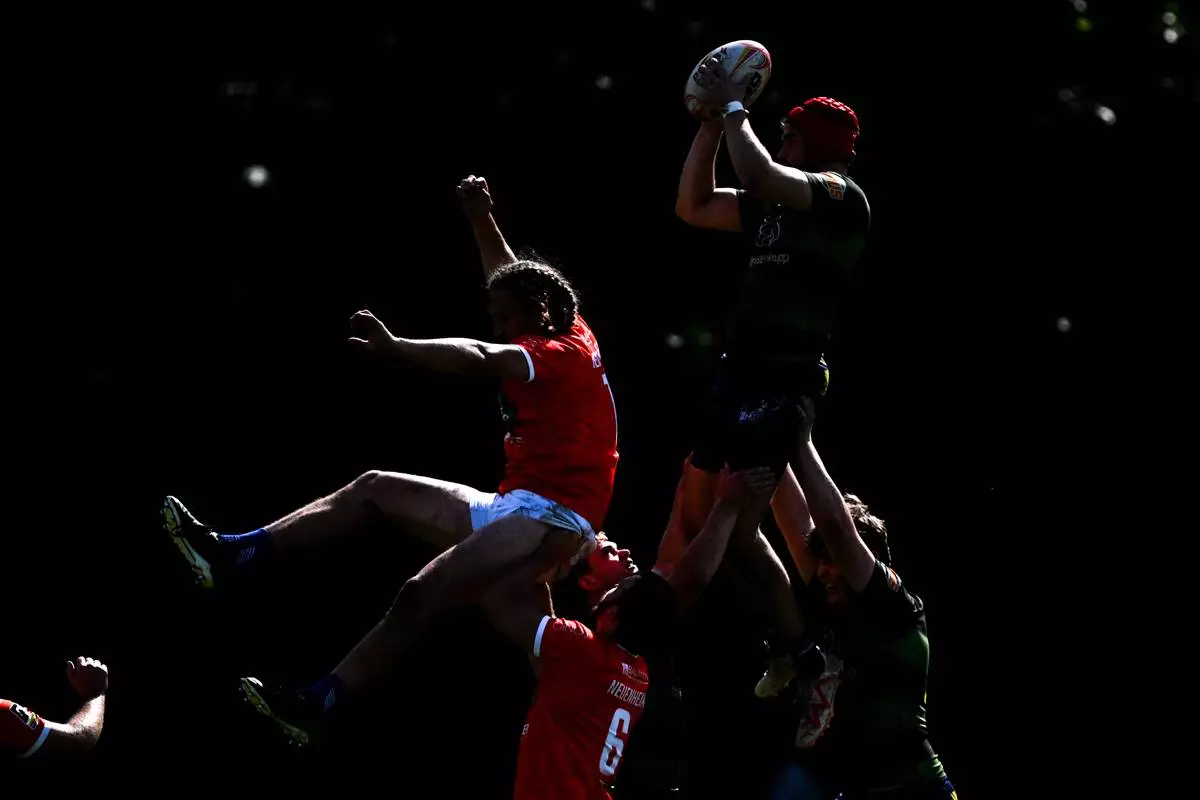 RC Leipzig players, right, battle for a line-out throw during the seventh place match at the German rugby sevens championship, Friday, Aug. 1, 2025, in Dresden, Germany. (Hendrik Schmidt/dpa via AP)