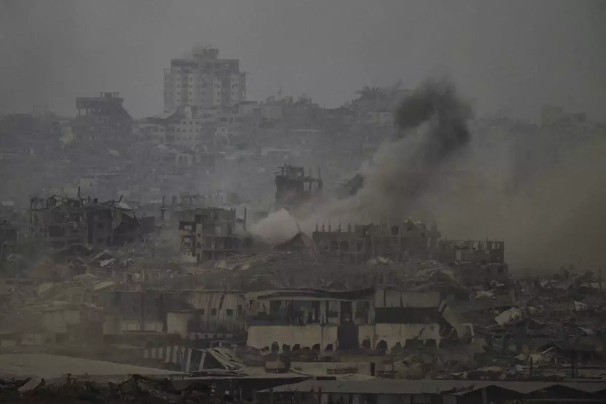 Smoke rises amid destroyed buildings following an Israeli shelling in the Gaza Strip, as seen from southern Israel, Friday, Aug. 1, 2025. (AP Photo/Leo Correa)