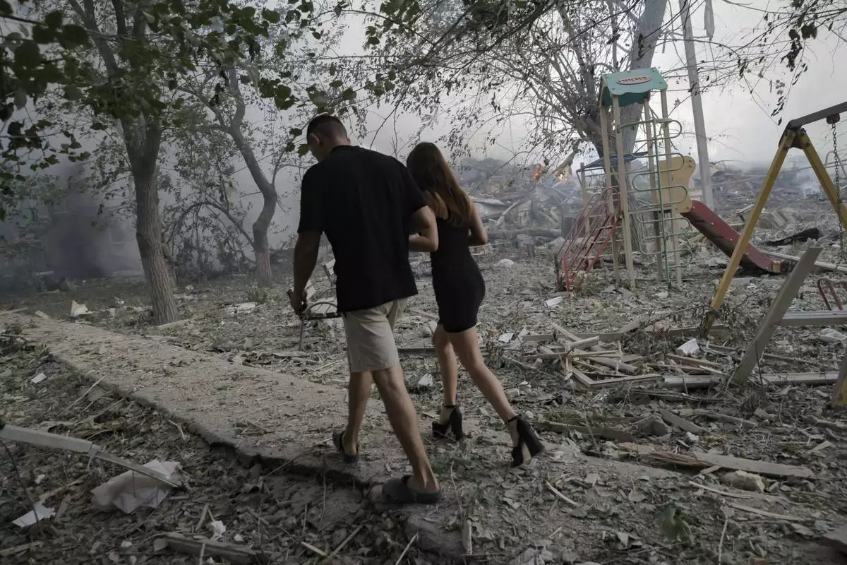 Residents pass by the site of the Russian air strike which destroyed a residential house in Kramatorsk, Ukraine, on Thursday, July 31, 2025. (AP Photo/Yevhen Titov)