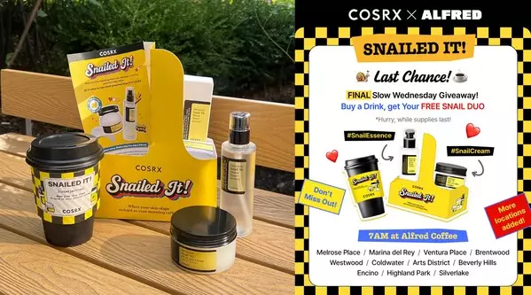 To spotlight the collaboration, COSRX and Alfred Coffee have turned midweek fatigue into a moment of joy by rebranding Wednesdays, the longest day of the week, as "Slow Wednesdays". Inspired by the brand's snail mucin hero ingredient, the campaign encourages Angelenos to pause, pamper, and perk up with a dose of skincare and coffee. Starting at 7 AM every Wednesday in July, early birds at participating Alfred Coffee locations were treated to a full-sized Snail Essence and Cream set with any drink purchase. Products flew off the shelves within hours, and what started as a six-store giveaway quickly turned into a citywide sensation.