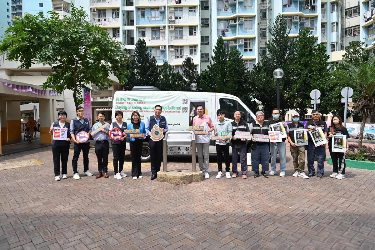 Hong Kong Customs conducted a joint anti-illicit cigarette publicity campaign with Legislative Council Member Mr Leung Man-kwong, members of the Sham Shui Po District Council, the Tobacco and Alcohol Control Office (TACO) of the Department of Health and the Housing Department (HD) at Fu Cheong Estate in Sham Shui Po today (July 28).