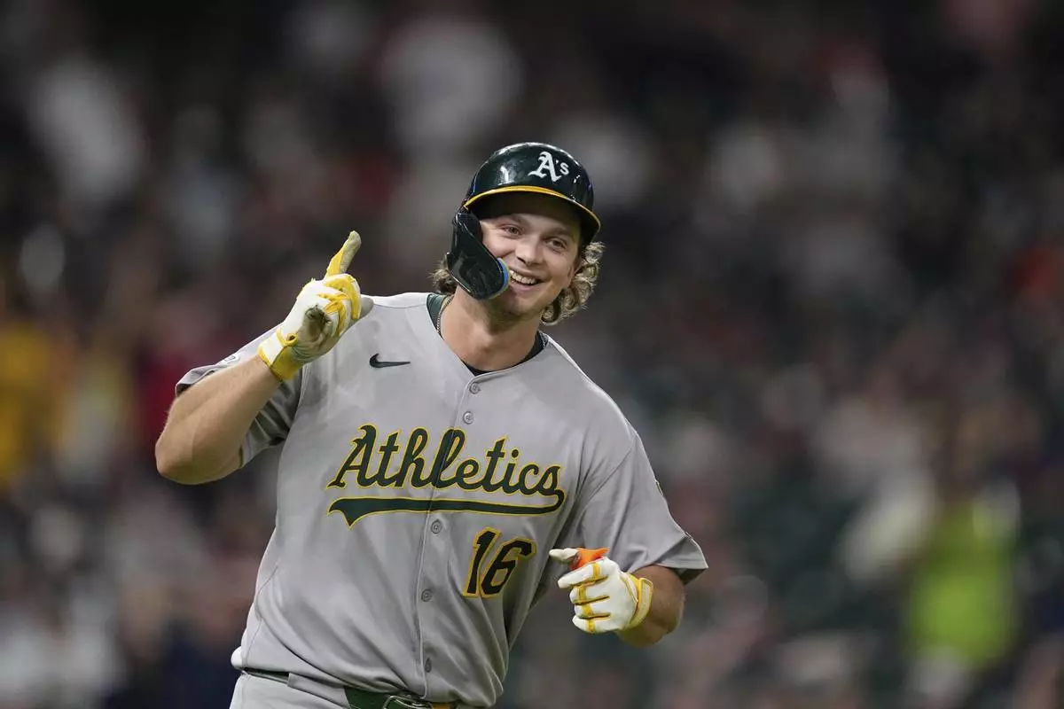 Athletics' Nick Kurtz celebrates after hitting a three-run home run, his fourth home run of the game, against the Houston Astros during the ninth inning of a baseball game Friday, July 25, 2025, in Houston. (AP Photo/David J. Phillip)