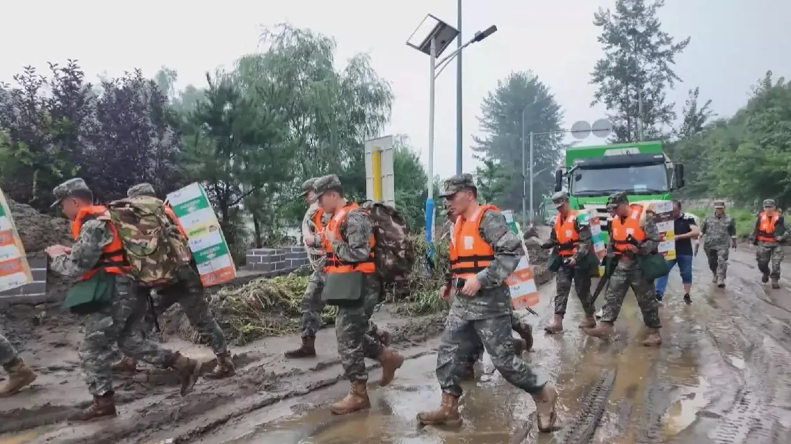 Continuous heavy rainfall in northeastern Beijing's Miyun District has triggered floods, and Fengjiayu Village, located in deep mountains, was once out of contact. Therefore, on Sunday, a total of 17 soldiers with the local People's Armed Police Force unit walked 13 kilometers to reach the village to deliver badly needed supplies.
