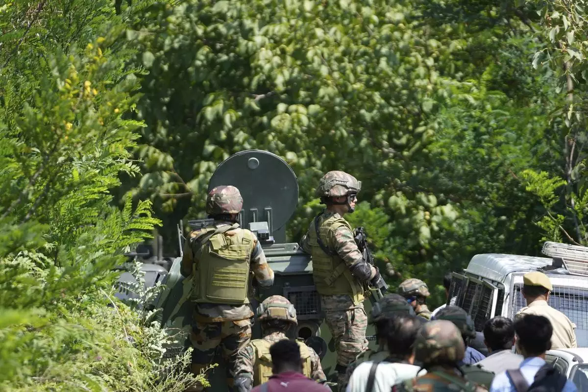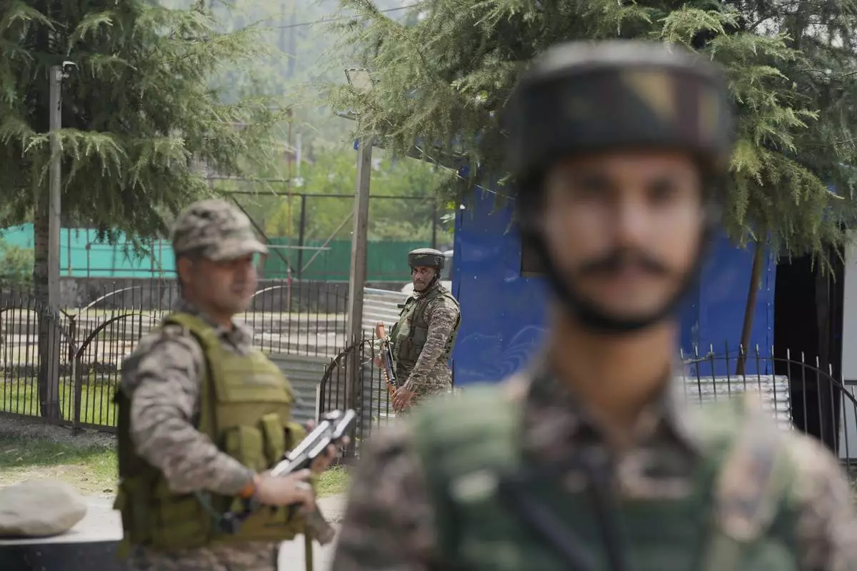 Indian soldiers guard near the site of a gun battle on the outskirts of Srinagar, Indian controlled Kashmir, Monday, July 28, 2025. (AP Photo/Mukhtar Khan)