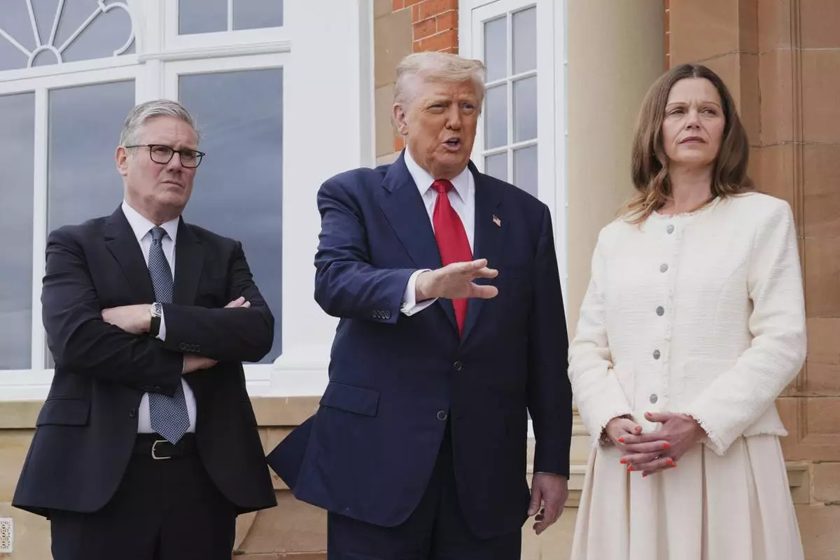President Donald Trump, center, speaks with the media as he greets Britain's Prime Minister Keir Starmer, left, and his wife Victoria at the Trump Turnberry golf course in Turnberry, Scotland Monday, July 28, 2025. (AP Photo/Jacquelyn Martin)