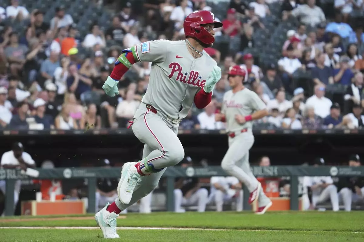 Philadelphia Phillies' Bryce Harper runs after hitting a two-run double during the third inning of a baseball game against the Chicago White Sox in Chicago, Monday, July 28, 2025. (AP Photo/Nam Y. Huh)