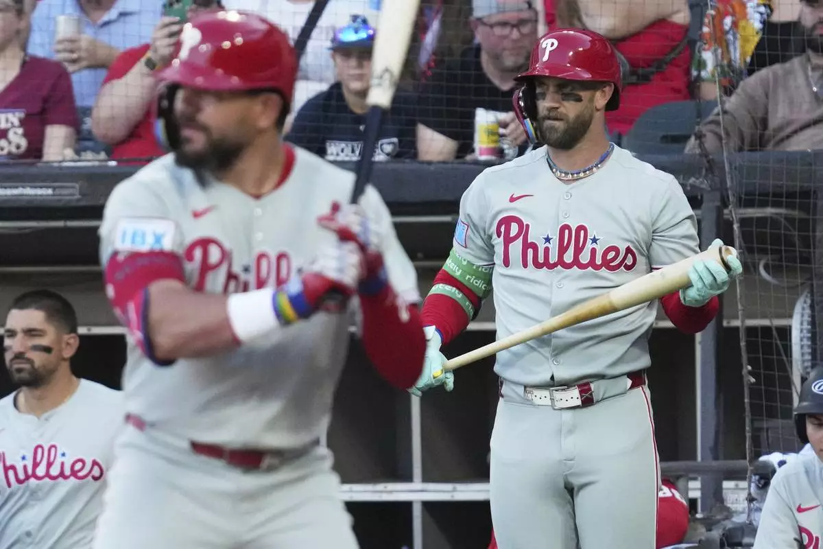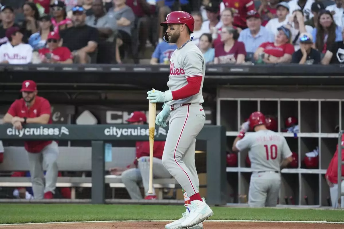 Philadelphia Phillies' Bryce Harper, right, watches Chicago White Sox starting pitcher Davis Martin (not shown) during the first inning of a baseball game in Chicago, Monday, July 28, 2025. (AP Photo/Nam Y. Huh)