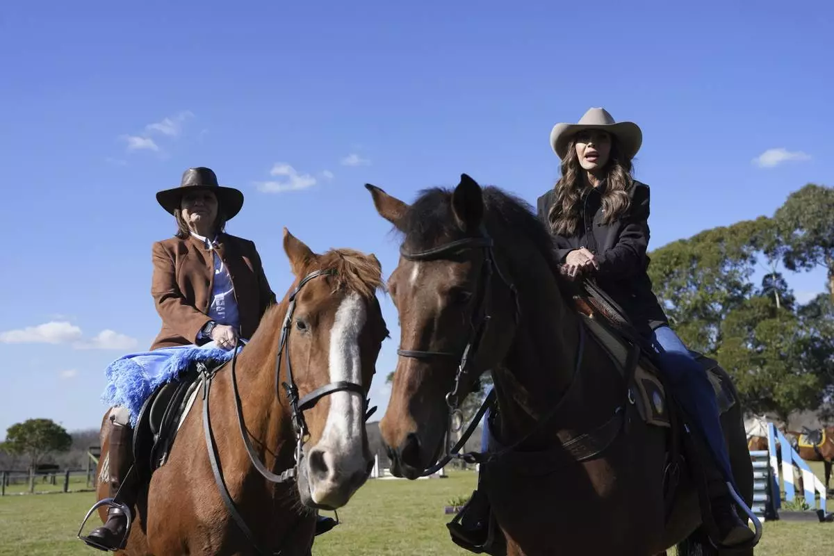U.S. Homeland Security Secretary Kristi Noem, right, and Argentine National Security Minister Patricia Bullrich sit on horses as they speak to the press upon arrival to the Campo De Mayo Military Base in Buenos Aires province, Argentina, Monday, July 28, 2025. (AP Photo/Alex Brandon, Pool)
