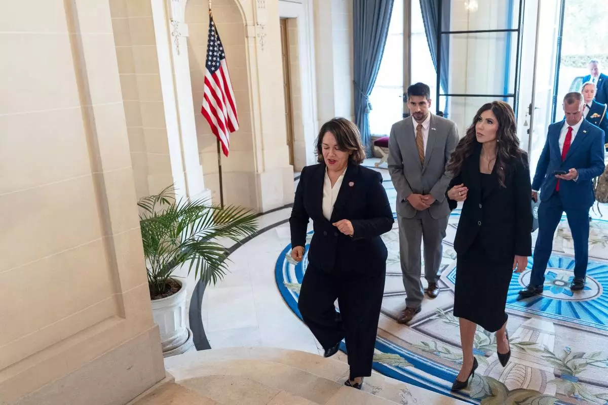Homeland Security Secretary Kristi Noem, second from right, walks with U.S. Embassy Charge d'Affaires Heidi Gomez, left, as she arrives at the Bosch Palace Monday, July 28, 2025, in Buenos Aires, Argentina. (AP Photo/Alex Brandon, Pool)