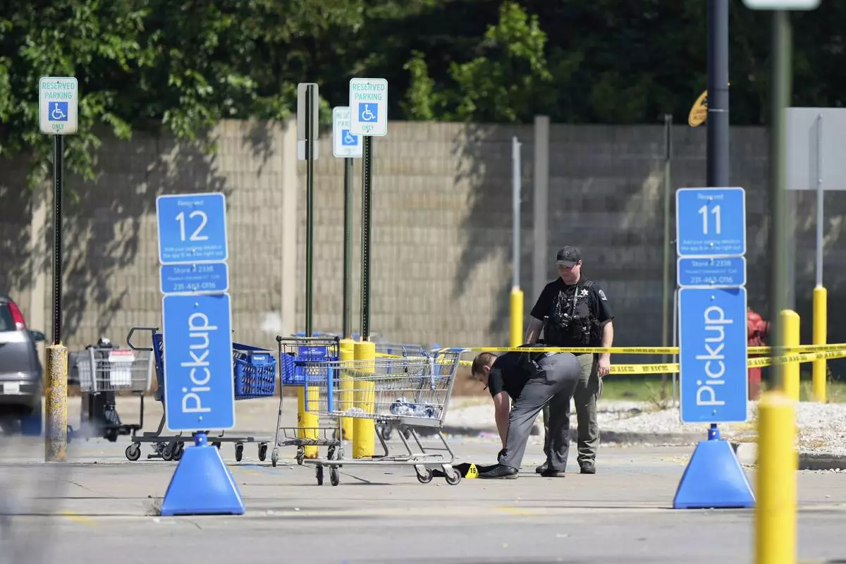 Officers investigate Sunday, July 27, 2025, the scene where 11 people were stabbed at a Walmart in Traverse City, Mich. (AP Photo/Ryan Sun)
