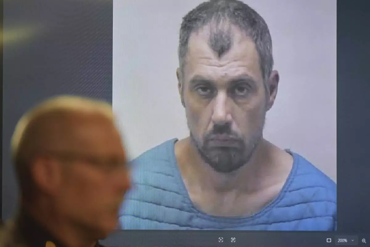 The booking photo of Bradford Gille, who is accused of stabbing 11 people at a Walmart, is seen behind Grand Traverse County Sheriff Mike Shea during a news conference Sunday, July 27, 2025, in Traverse City, Mich. (AP Photo/Ryan Sun)