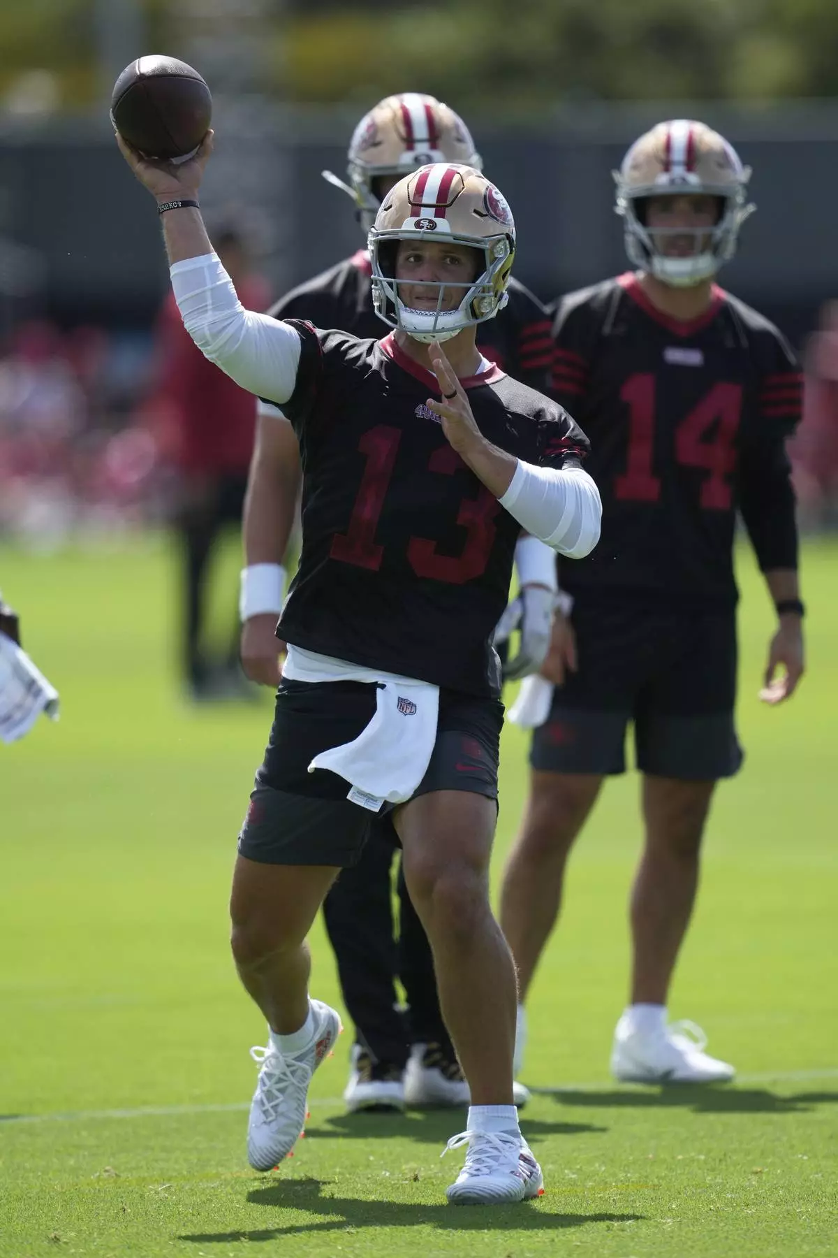 San Francisco 49ers quarterback Brock Purdy (13) passes during practice at the team's NFL football training camp, Wednesday, July 23, 2025, in Santa Clara, Calif. (AP Photo/Jeff Chiu)
