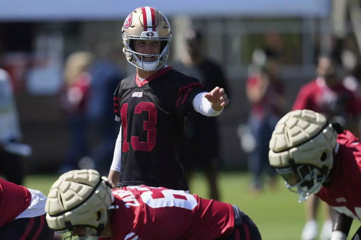 San Francisco 49ers quarterback Brock Purdy (13) gestures toward teammates during practice at the team's NFL football training camp, Sunday, July 27, 2025, in Santa Clara, Calif. (AP Photo/Jeff Chiu)