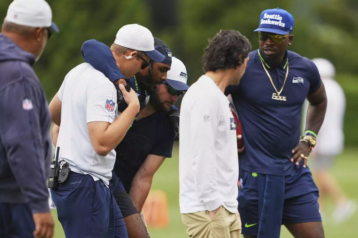 Seattle Seahawks running back Kenny McIntosh is walked off the field during the NFL football team's training camp Saturday, July 26, 2025, in Renton, Wash. (AP Photo/Lindsey Wasson)