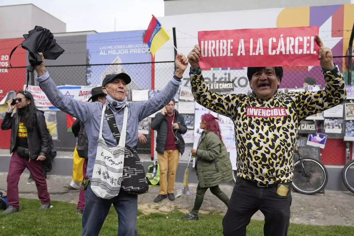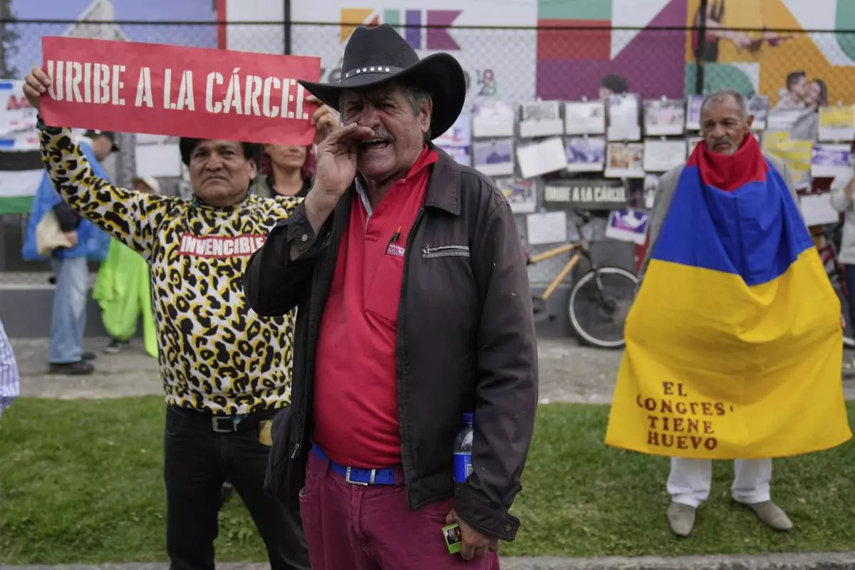 Opponents of former President Alvaro Uribe gather outside the court where a verdict is expected in his trial for witness tampering in Bogota, Colombia, Monday, July 28, 2025. (AP Photo/Fernando Vergara)
