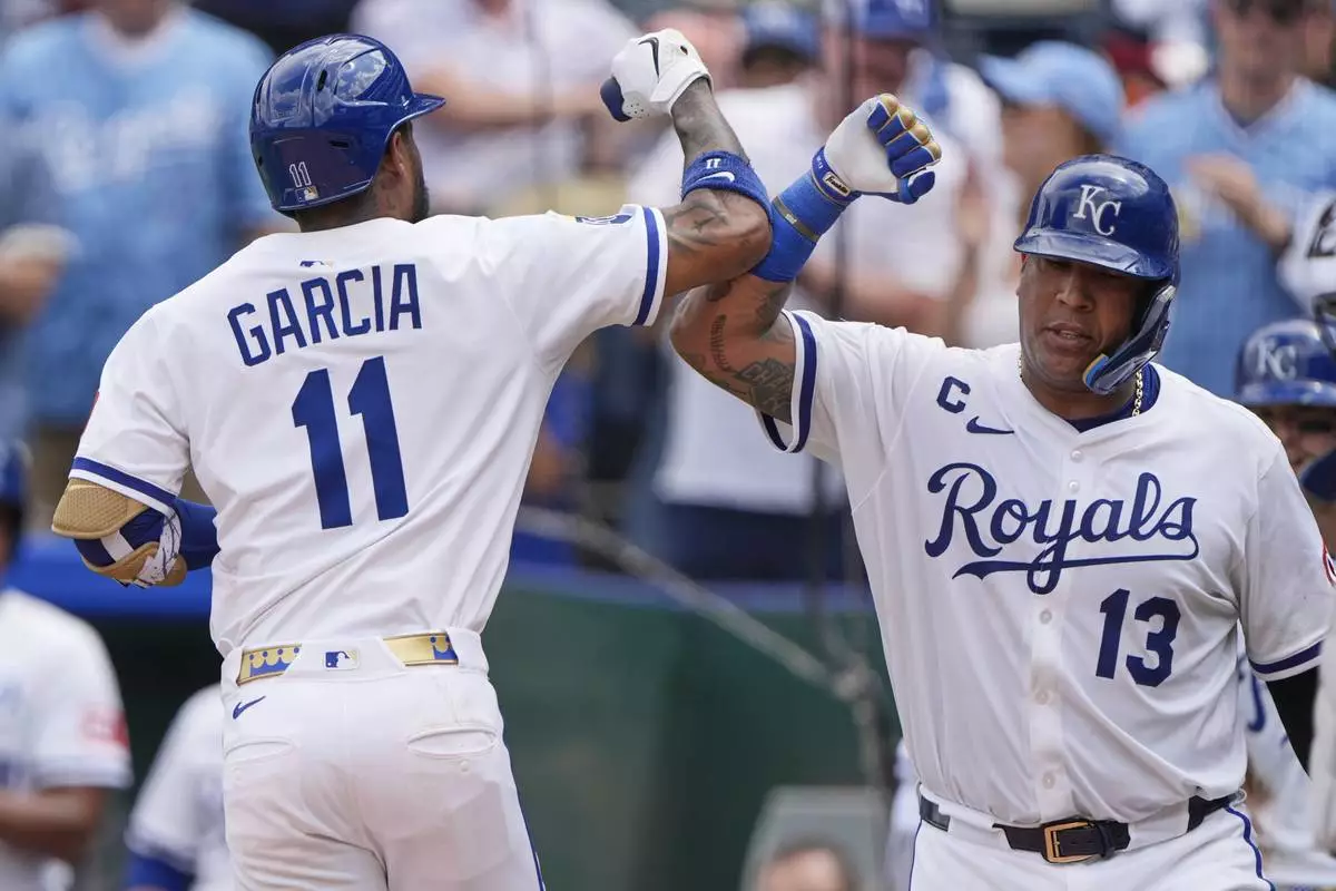 Kansas City Royals' Maikel Garcia (11) celebrates with Salvador Perez (13) after hitting a two-run home run during the fourth inning in the first baseball game of a doubleheader against the Cleveland Guardians, Saturday, July 26, 2025, in Kansas City, Mo. (AP Photo/Charlie Riedel)