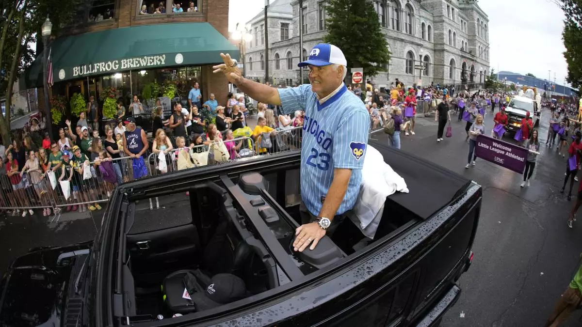 FILE - Baseball Hall of Fame infielder Ryne Sandberg, the Grand Marshall of this year's Little League Grand Slam Parade, rides through downtown Williamsport, Pa., Monday, Aug. 14, 2023. (AP Photo/Gene J. Puskar,File)