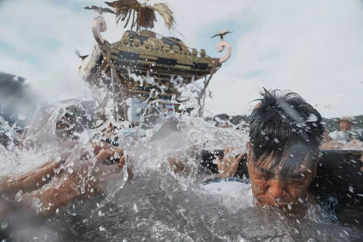 Participants carry a portable shrine, or mikoshi, into the sea during a purification rite at the annual Kurihama Sumiyoshi Shrine Festival at Kurihama, Yokosuka city, south of Tokyo Sunday, July 27, 2025. (AP Photo/Eugene Hoshiko)