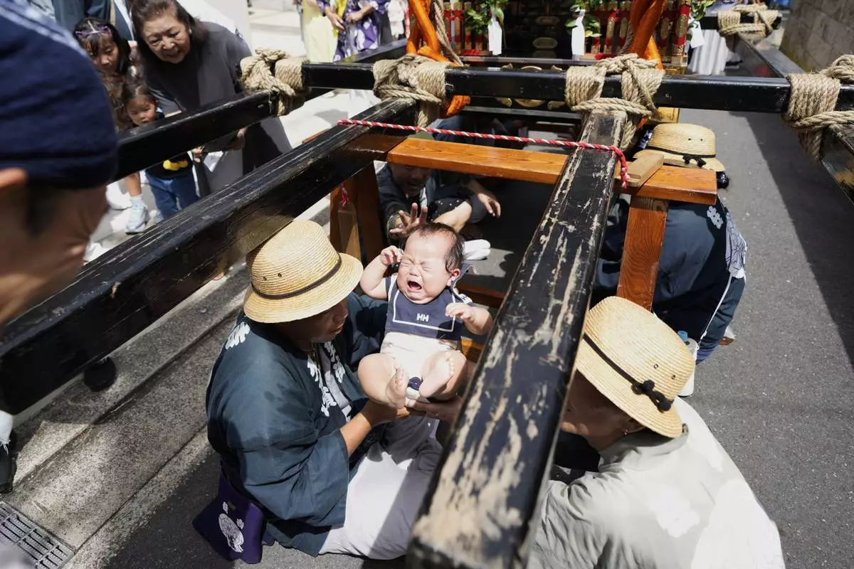 Participants pass a newborn baby underneath a portable shrine, or mikoshi, intended to bring good fortune, during the annual Kurihama Sumiyoshi Shrine Festival at Kurihama, Yokosuka city, south of Tokyo Sunday, July 27, 2025. (AP Photo/Eugene Hoshiko)