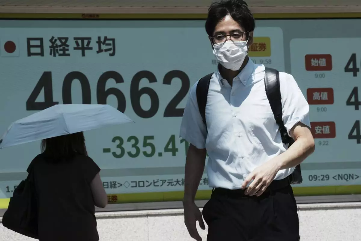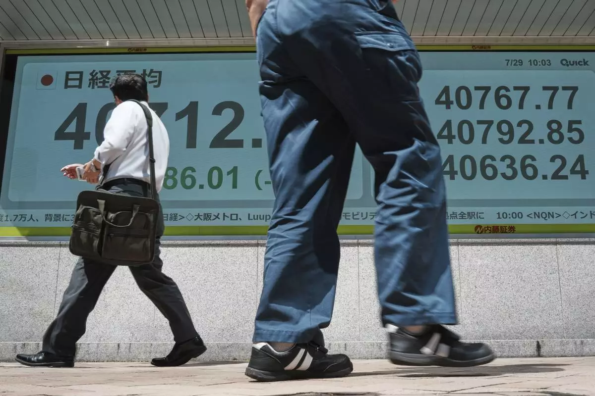 A person walks in front of an electronic stock board showing Japan's Nikkei index at a securities firm Tuesday, July 29, 2025, in Tokyo. (AP Photo/Eugene Hoshiko)